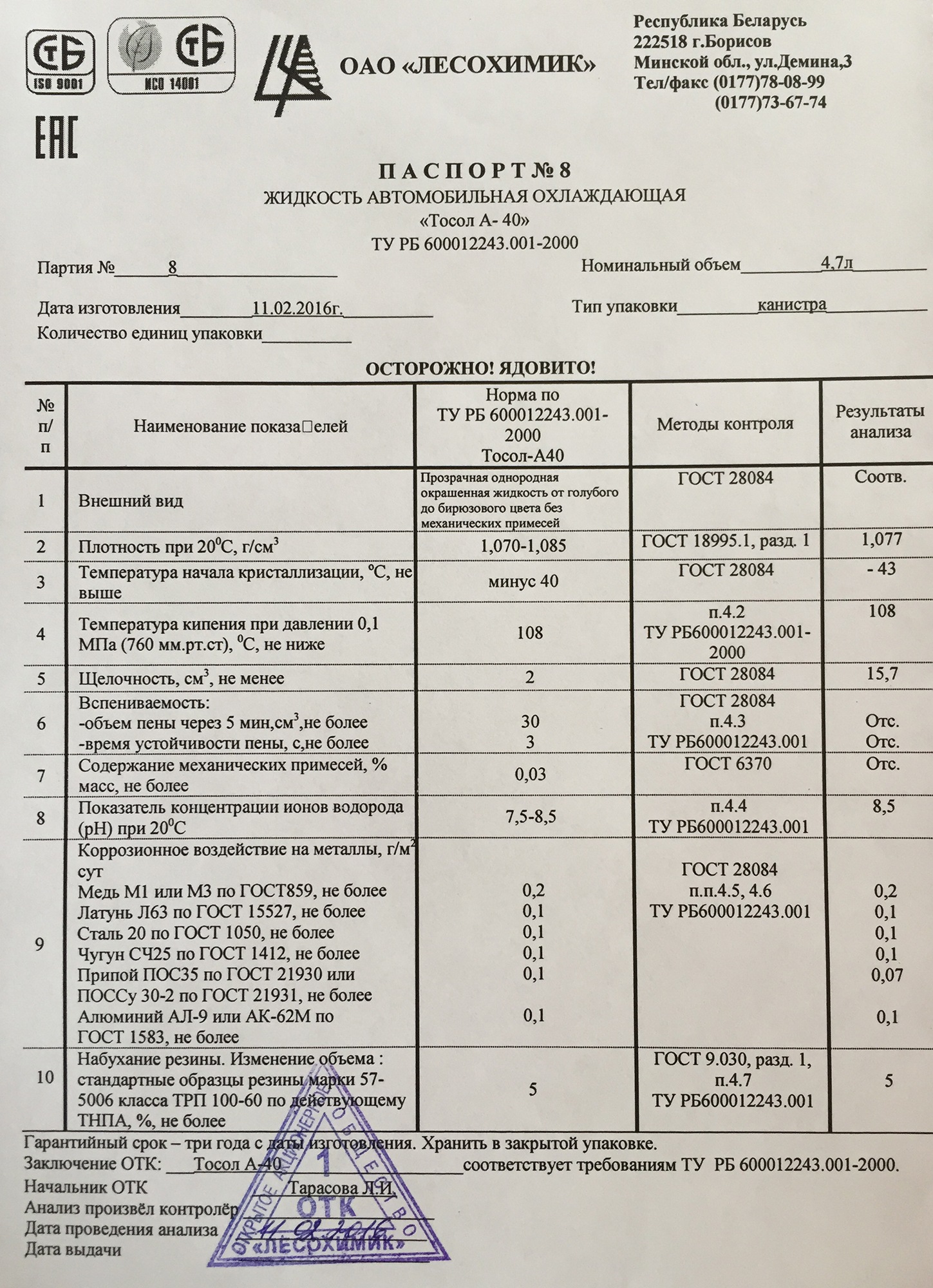 Жидкость представляет собой водный раствор этиленгликоля с антикоррозионными, антивспенивающими и красящими добавками.