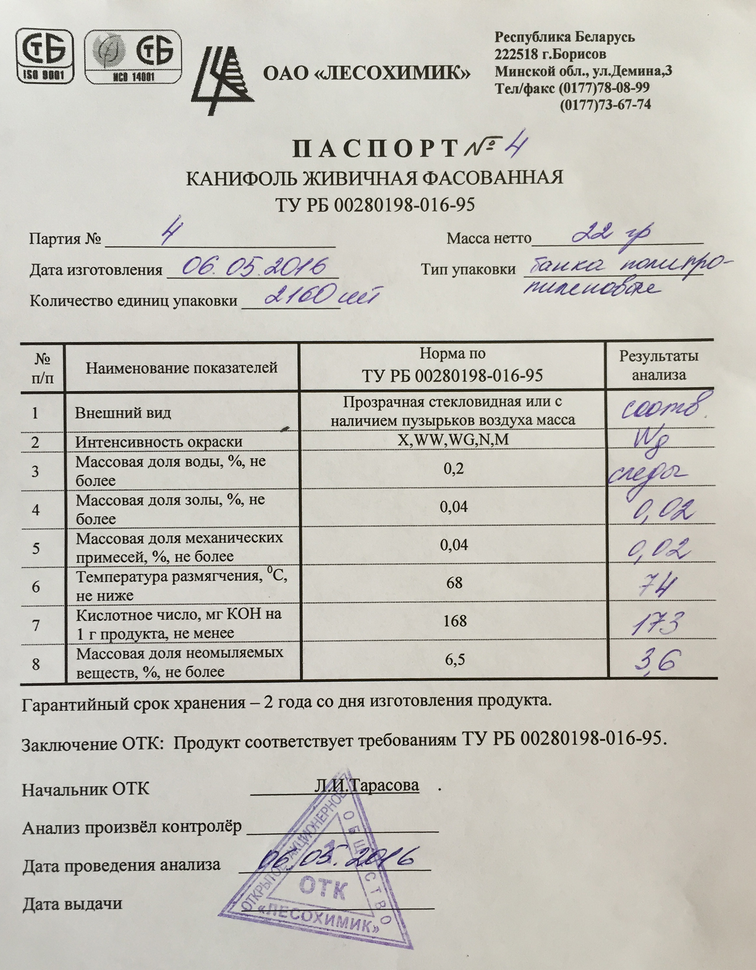 По физико-химическим показателям канифоль соответствует требованиям и нормам ТУ РБ 00280198-016-95, указанным в таблице.