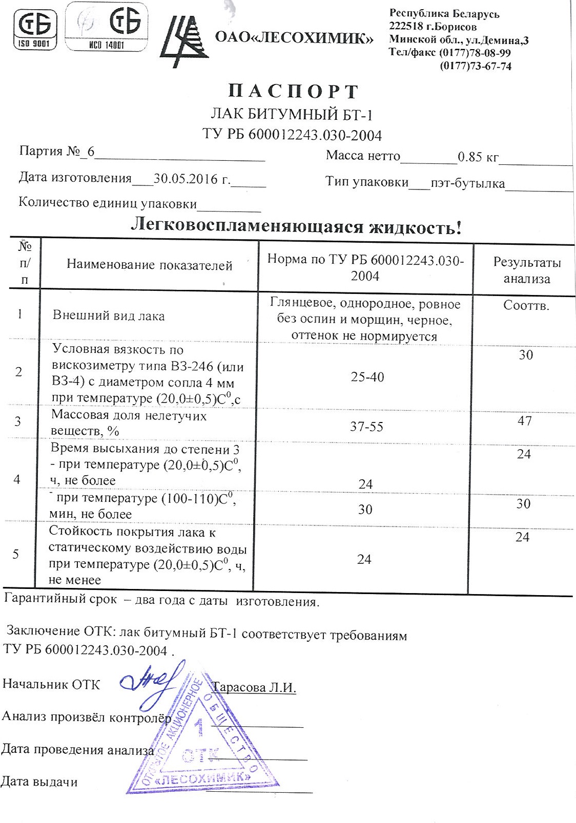 Лак битумный БТ-1 ТУ РБ 600012243.030-2004. Представляет собой раствор битума нефтяного в органических растворителях. Предназначен для защиты поверхностей металлических конструкций и изделий при непродолжительном их хранении и транспортировании (шесть месяцев в умеренном климате) для однослойного покрытия, а также для изготовления алюминиевой краски.