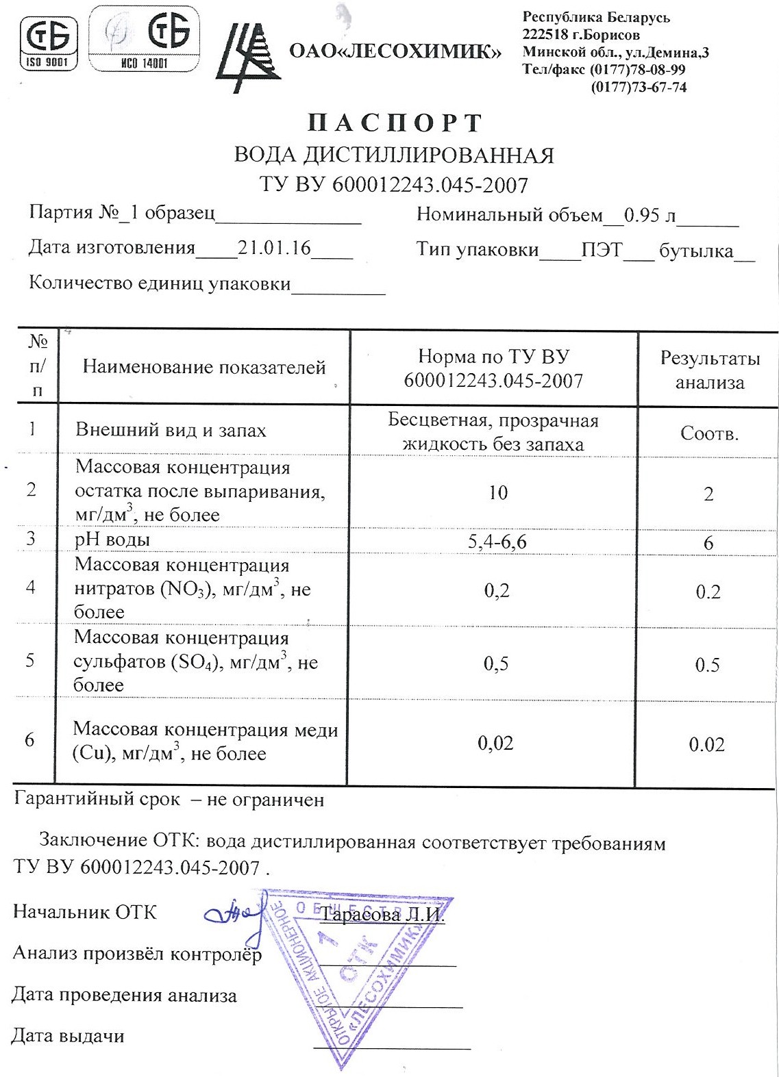 Вода дистиллированная по ТУ ВY 600012243.045-2007 получают путем глубокой очистки исходной воды от механических примесей и растворенных солей на комбинированной мембранной установке.