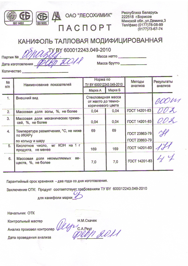Канифоль по физико-химическим показателям соответствует требованиям и нормам ТУ ВY 600012243.049-2010, указанным в таблице.
